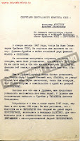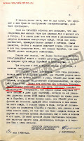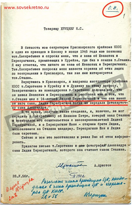 «Возвратившись из командировки, т. Сиротенко доложил мне, что он нашёл Ивановых и Перепрыгиных, и рассказал мне о том, что т. Сталин жил с 14-летней Лидией Перепрыгиной, и что она имеет от него сына. Лидия Перепрыгина тогда же передала фотографию сына Александра.