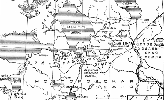 Ладожская земля в конце 10 — начале 13 в. Границы показаны схематически (основа карты по А. М. Насонову).