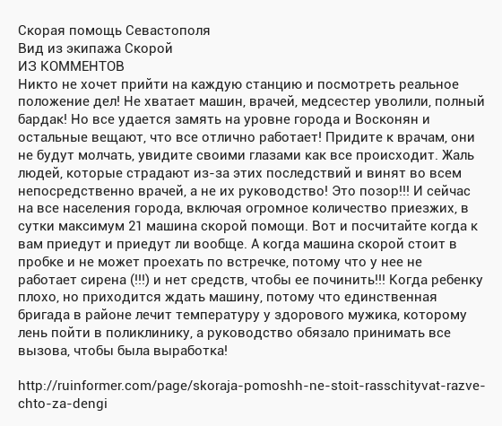 Date: 2015-05-11 06:49 am (UTC)А еще водителей скорой помощи оформляют как санитаров (С 1 апреля 2015 года работа экстренной медицинской помощи должна быть переведена на стандарты Российской Федерации, согласно «которым в бригадах Скорой помощи не должно быть медсестер и санитаров; в состав бригады входят санитар-водитель, фельдшер и врач».). За бесплатно. По российским стандартам. Хотел бы я знать, где такое видано, где такое слыхано!